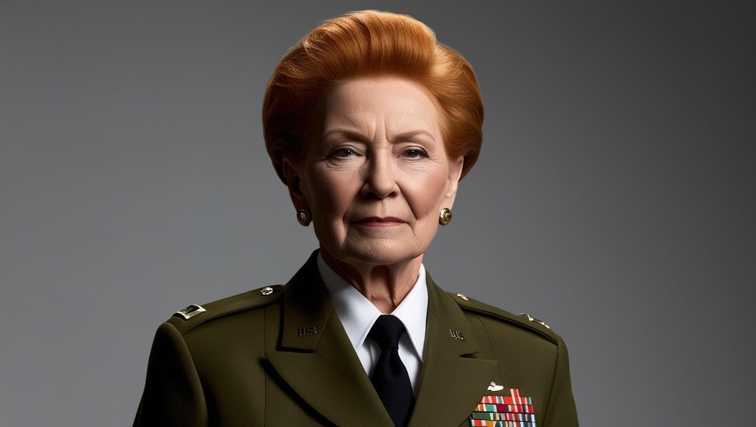 Mujer de unos 80 años comandante General del ejercito. Pelo rojo a lo chico. Mala cara. Dominante.